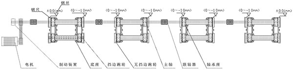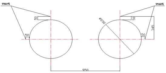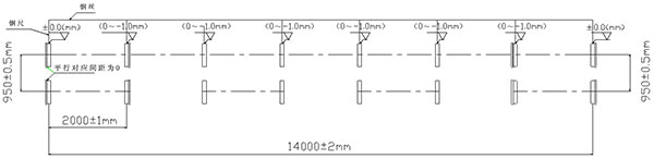 第二次調(diào)整:①卸下全部的夾軸器,按照以上粗調(diào)的步驟來(lái)精調(diào)離心機(jī)的水平精度;②調(diào)整要求:水平方向,調(diào)整主、從動(dòng)輪軸承座旁的調(diào)節(jié)螺釘使主動(dòng)軸與副軸中心線在同一水平面上間距為950mm,兩端的寬度差(平行度)≦±0.5mm;垂直方向各輪的水平度誤差±1mm,前后輪略高0.5mm;調(diào)整各組跑輪使長(zhǎng)度方向中心距為2000mm±1mm,總托輪距累積誤差≦±2mm。③帶擋邊主、副輪與模具接觸面要對(duì)應(yīng)對(duì)齊,調(diào)整后要鎖緊,防止工作時(shí)移位(圖示一);④底部的墊鐵、斜鐵要打緊,緊定好螺母,重新裝好夾軸器,進(jìn)行第二次灌漿。