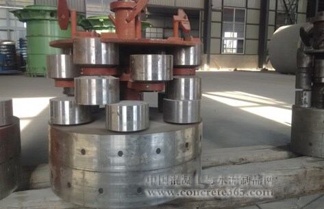 該工藝采用立式生產(chǎn)方法,模具垂直豎立于地面上的底托盤上,承口振動及工位旋轉(zhuǎn)裝置置于地坑內(nèi),擠壓及升降等主要裝置均在地面上。 徑向擠壓制管工藝采用半干硬性混凝土,布料機構向管模內(nèi)喂料,通過擠壓成型頭(圖1)的高速旋轉(zhuǎn)擠壓管模間的混凝土,擠壓成型頭的直徑尺寸就是管道的內(nèi)徑尺寸,擠壓同時上部成型頭以一定速度上升,使之成型,下部休整頭以反方向擠壓、磨光。 徑向擠壓制管工藝生產(chǎn)承插口管時由于承口部分的斜度單擠壓難以使混凝土密實,承口部分的成型須配以輔助振動,一般還需噴灑少量的水,以調(diào)整承口部分混凝土的塑性。 ![]() (圖1)