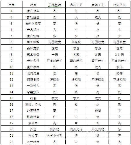 立式徑向擠壓制管作為新型的制管工藝最大的優(yōu)點在于采用干硬性混凝土,立式生產(chǎn)后可立即脫模。瞬時擠壓成型,每根管僅用2~3min,生產(chǎn)效率高。但同時它的抗?jié)B性較差的缺點也比較突出,需要在制管過程中嚴格控制各種參數(shù)加以修正。 下面通過幾種制管工藝的比較來說明各自的特點: ![]()