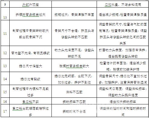 每天或每種管型生產(chǎn)時都要根據(jù)第一根管子的質(zhì)量來對相關數(shù)據(jù)或其他的方面進行修改,保證產(chǎn)品質(zhì)量。 各項數(shù)據(jù)牽扯到的影響在此不再贅述?傊,在試生產(chǎn)階段,要對試制產(chǎn)品進行各項實驗測定,包括各部位尺寸偏差、保護層厚度、密實度、內(nèi)外壓、外觀質(zhì)量等等。針對實驗結(jié)果修改相關參數(shù)。 此項目對制管的成敗起到了至關重要的作用,望引起足夠重視。 以下為我公司立式徑向擠壓產(chǎn)品成果。 ![]() 成品外壁 ![]() 成品內(nèi)壁 ![]() 成品擺放 ![]() 成品養(yǎng)護