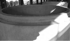 (3)改進(jìn)效果:經(jīng)過(guò)對(duì)混凝土配合比、布料速度、啟振時(shí)機(jī)、振動(dòng)頻率、振動(dòng)時(shí)間、碾壓時(shí)間及碾壓力的調(diào)整和規(guī)范,產(chǎn)品成型脫模后的管體外觀質(zhì)量大為提高,基本消除了管壁表面蜂窩、麻面等缺陷,如圖2所示。 ![]() 圖2 改進(jìn)后的管壁外觀照片
